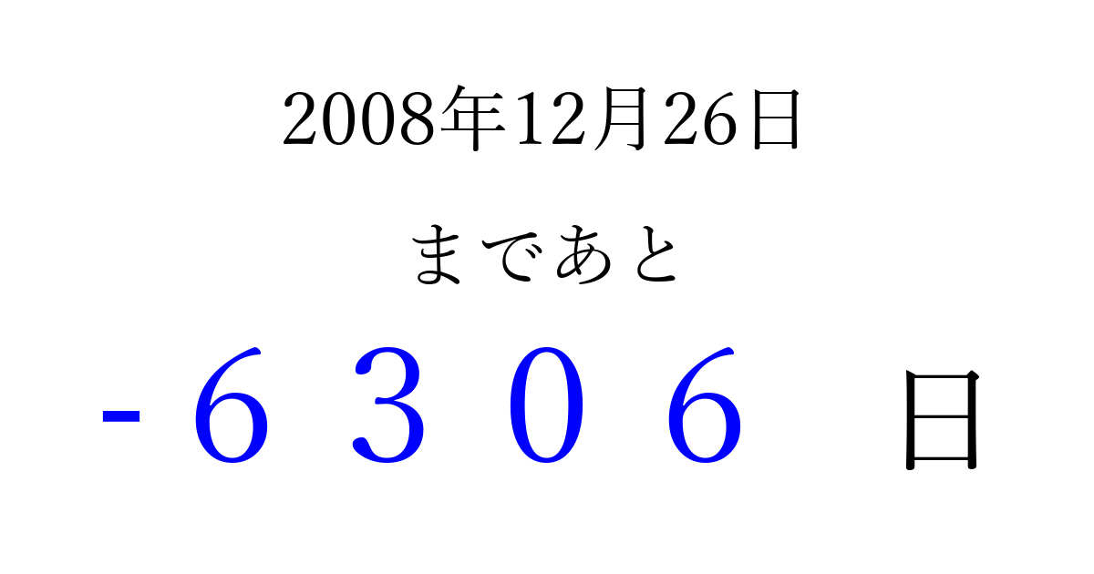2008年12月26日(金)は もう 0000 日過ぎました 追加すると、トップページからすぐ選べるようになります ※2026/04/02現在の結果です。 最新の状態に更新する ↓シェアして、タイムライン上にカウントダウンを表示しよう!↓ 📤 この結果を共有する Tweet シェア Threads Bluesky 別の日付でカウントダウン 2008年12月のカレンダー このページをブックマークに追加すると、いつでもカウントダウンを確認できます。 (PC: Ctrl+D / Mac: ⌘+D) hitome-notes.comでは以下のページも運営しています。 指定日と期間から日付を計算 | ガチャ確率計算・シミュレーション | プライバシー・ポリシー 運営者:Avocado