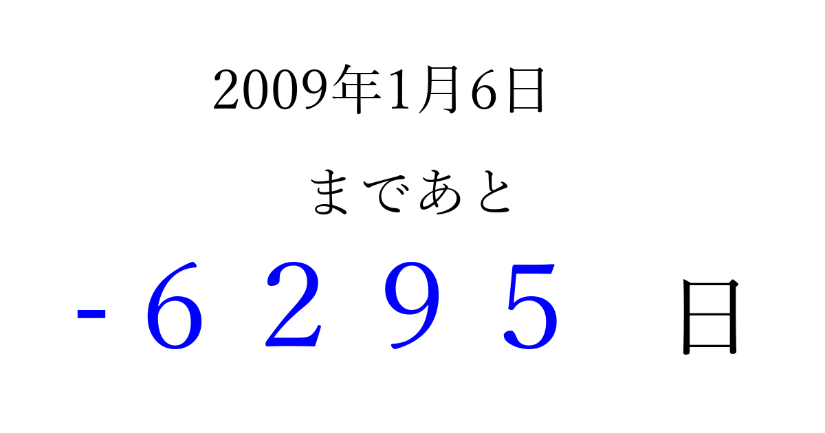 2009年1月6日(火)は もう 0000 日過ぎました 追加すると、トップページからすぐ選べるようになります ※2026/04/02現在の結果です。 最新の状態に更新する ↓シェアして、タイムライン上にカウントダウンを表示しよう!↓ 📤 この結果を共有する Tweet シェア Threads Bluesky 別の日付でカウントダウン 2009年1月のカレンダー このページをブックマークに追加すると、いつでもカウントダウンを確認できます。 (PC: Ctrl+D / Mac: ⌘+D) hitome-notes.comでは以下のページも運営しています。 指定日と期間から日付を計算 | ガチャ確率計算・シミュレーション | プライバシー・ポリシー 運営者:Avocado