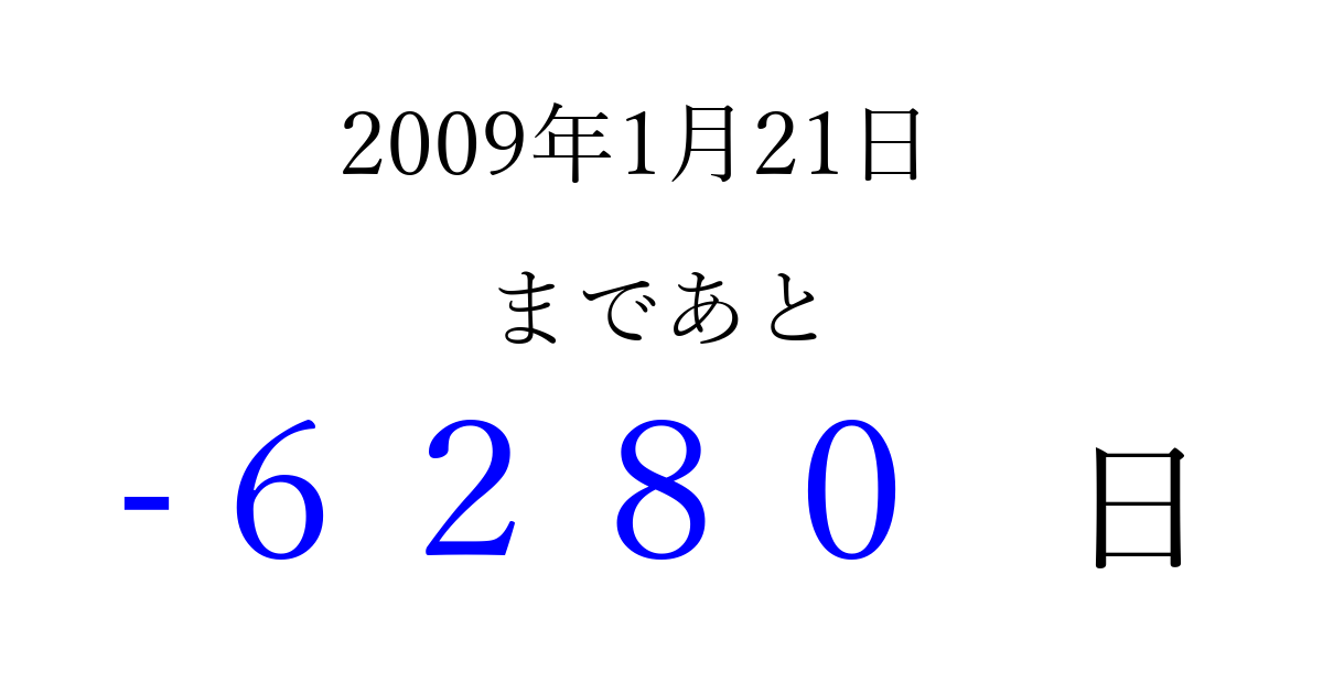 2009年1月21日(水)は もう 0000 日過ぎました 追加すると、トップページからすぐ選べるようになります ※2026/04/02現在の結果です。 最新の状態に更新する ↓シェアして、タイムライン上にカウントダウンを表示しよう!↓ 📤 この結果を共有する Tweet シェア Threads Bluesky 別の日付でカウントダウン 2009年1月のカレンダー このページをブックマークに追加すると、いつでもカウントダウンを確認できます。 (PC: Ctrl+D / Mac: ⌘+D) hitome-notes.comでは以下のページも運営しています。 指定日と期間から日付を計算 | ガチャ確率計算・シミュレーション | プライバシー・ポリシー 運営者:Avocado