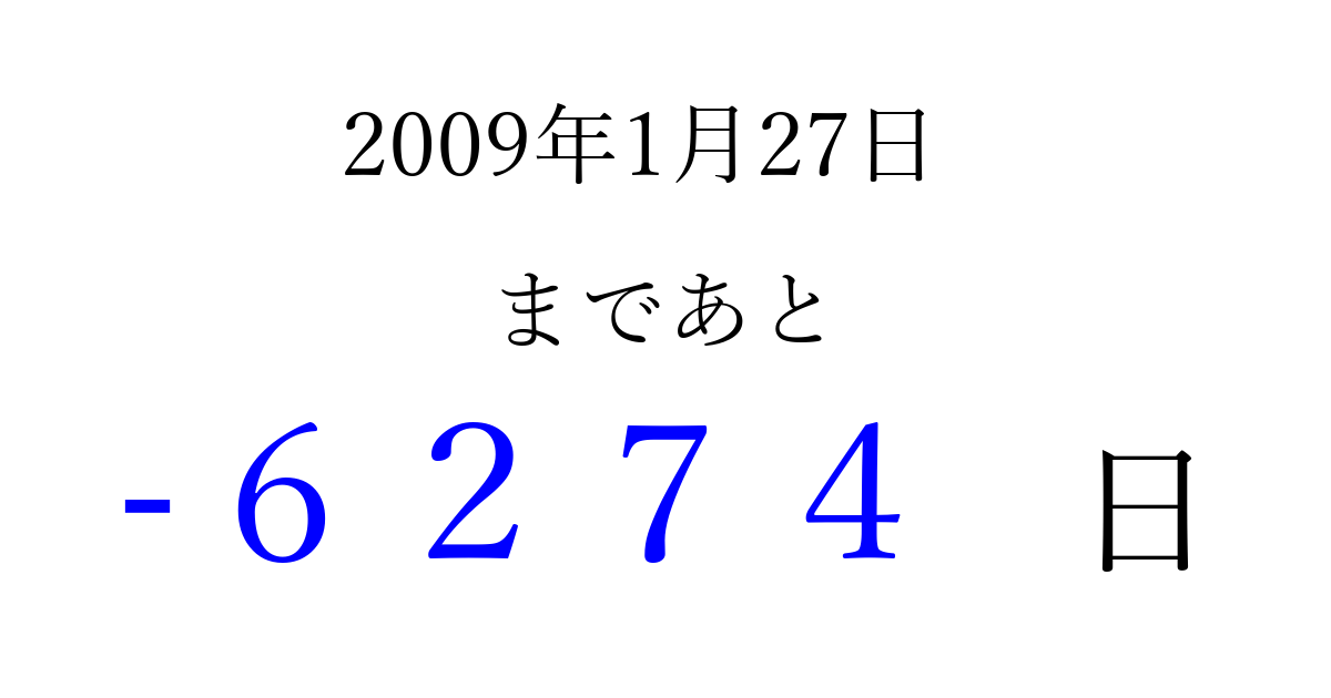 2009年1月27日(火)は もう 0000 日過ぎました 追加すると、トップページからすぐ選べるようになります ※2026/04/02現在の結果です。 最新の状態に更新する ↓シェアして、タイムライン上にカウントダウンを表示しよう!↓ 📤 この結果を共有する Tweet シェア Threads Bluesky 別の日付でカウントダウン 2009年1月のカレンダー このページをブックマークに追加すると、いつでもカウントダウンを確認できます。 (PC: Ctrl+D / Mac: ⌘+D) hitome-notes.comでは以下のページも運営しています。 指定日と期間から日付を計算 | ガチャ確率計算・シミュレーション | プライバシー・ポリシー 運営者:Avocado