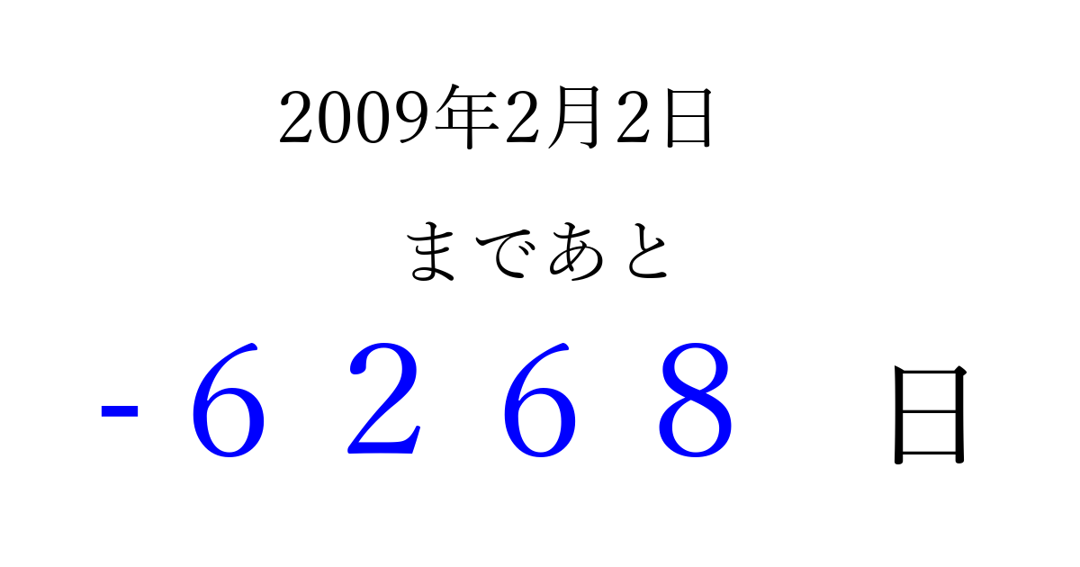 2009年2月2日(月)は もう 0000 日過ぎました 追加すると、トップページからすぐ選べるようになります ※2026/04/02現在の結果です。 最新の状態に更新する ↓シェアして、タイムライン上にカウントダウンを表示しよう!↓ 📤 この結果を共有する Tweet シェア Threads Bluesky 別の日付でカウントダウン 2009年2月のカレンダー このページをブックマークに追加すると、いつでもカウントダウンを確認できます。 (PC: Ctrl+D / Mac: ⌘+D) hitome-notes.comでは以下のページも運営しています。 指定日と期間から日付を計算 | ガチャ確率計算・シミュレーション | プライバシー・ポリシー 運営者:Avocado