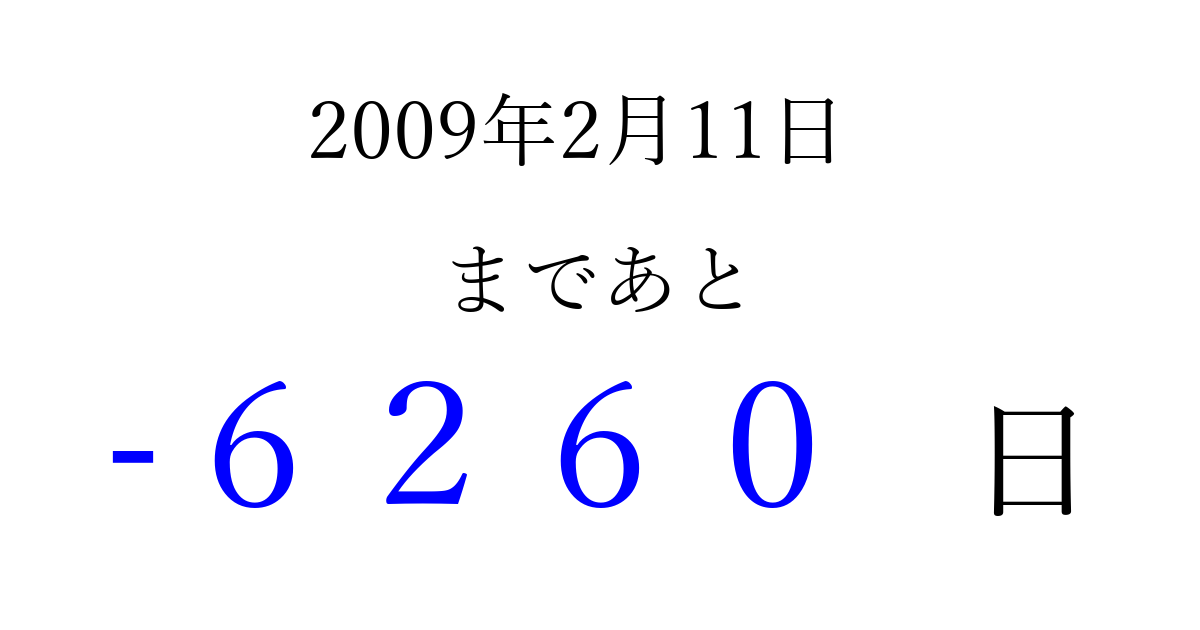 2009年2月11日(水)は もう 0000 日過ぎました 追加すると、トップページからすぐ選べるようになります ※2026/04/03現在の結果です。 最新の状態に更新する ↓シェアして、タイムライン上にカウントダウンを表示しよう!↓ 📤 この結果を共有する Tweet シェア Threads Bluesky 別の日付でカウントダウン 2009年2月のカレンダー このページをブックマークに追加すると、いつでもカウントダウンを確認できます。 (PC: Ctrl+D / Mac: ⌘+D) hitome-notes.comでは以下のページも運営しています。 指定日と期間から日付を計算 | ガチャ確率計算・シミュレーション | プライバシー・ポリシー 運営者:Avocado