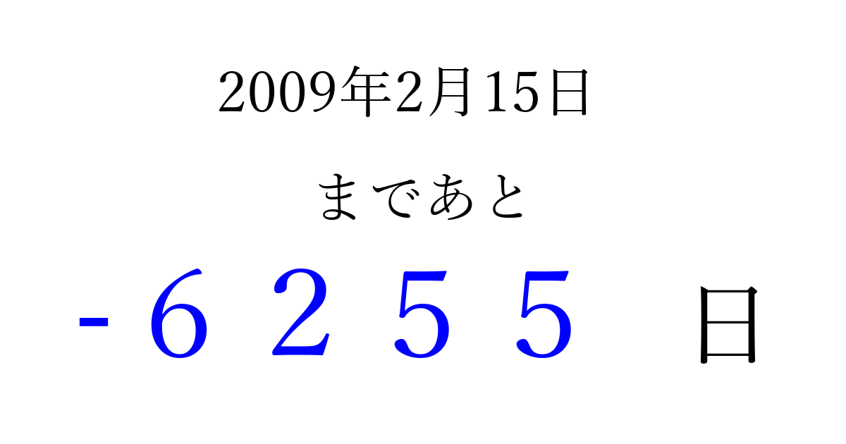 2009年2月15日(日)は もう 0000 日過ぎました 追加すると、トップページからすぐ選べるようになります ※2026/04/02現在の結果です。 最新の状態に更新する ↓シェアして、タイムライン上にカウントダウンを表示しよう!↓ 📤 この結果を共有する Tweet シェア Threads Bluesky 別の日付でカウントダウン 2009年2月のカレンダー このページをブックマークに追加すると、いつでもカウントダウンを確認できます。 (PC: Ctrl+D / Mac: ⌘+D) hitome-notes.comでは以下のページも運営しています。 指定日と期間から日付を計算 | ガチャ確率計算・シミュレーション | プライバシー・ポリシー 運営者:Avocado