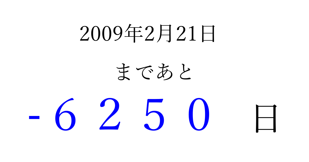 2009年2月21日(土)は もう 0000 日過ぎました 追加すると、トップページからすぐ選べるようになります ※2026/04/03現在の結果です。 最新の状態に更新する ↓シェアして、タイムライン上にカウントダウンを表示しよう!↓ 📤 この結果を共有する Tweet シェア Threads Bluesky 別の日付でカウントダウン 2009年2月のカレンダー このページをブックマークに追加すると、いつでもカウントダウンを確認できます。 (PC: Ctrl+D / Mac: ⌘+D) hitome-notes.comでは以下のページも運営しています。 指定日と期間から日付を計算 | ガチャ確率計算・シミュレーション | プライバシー・ポリシー 運営者:Avocado