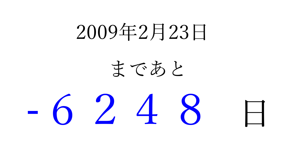 2009年2月23日(月)は もう 0000 日過ぎました 追加すると、トップページからすぐ選べるようになります ※2026/04/03現在の結果です。 最新の状態に更新する ↓シェアして、タイムライン上にカウントダウンを表示しよう!↓ 📤 この結果を共有する Tweet シェア Threads Bluesky 別の日付でカウントダウン 2009年2月のカレンダー このページをブックマークに追加すると、いつでもカウントダウンを確認できます。 (PC: Ctrl+D / Mac: ⌘+D) hitome-notes.comでは以下のページも運営しています。 指定日と期間から日付を計算 | ガチャ確率計算・シミュレーション | プライバシー・ポリシー 運営者:Avocado