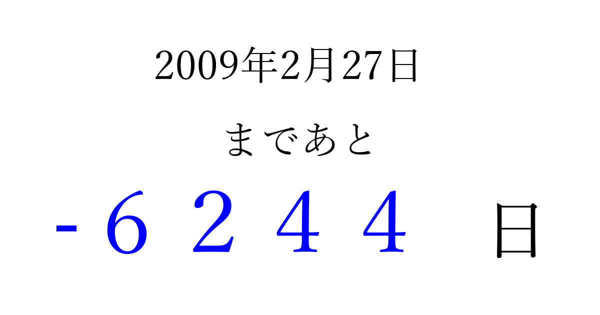 2009年2月27日(金)は もう 0000 日過ぎました 追加すると、トップページからすぐ選べるようになります ※2026/04/03現在の結果です。 最新の状態に更新する ↓シェアして、タイムライン上にカウントダウンを表示しよう!↓ 📤 この結果を共有する Tweet シェア Threads Bluesky 別の日付でカウントダウン 2009年2月のカレンダー このページをブックマークに追加すると、いつでもカウントダウンを確認できます。 (PC: Ctrl+D / Mac: ⌘+D) hitome-notes.comでは以下のページも運営しています。 指定日と期間から日付を計算 | ガチャ確率計算・シミュレーション | プライバシー・ポリシー 運営者:Avocado