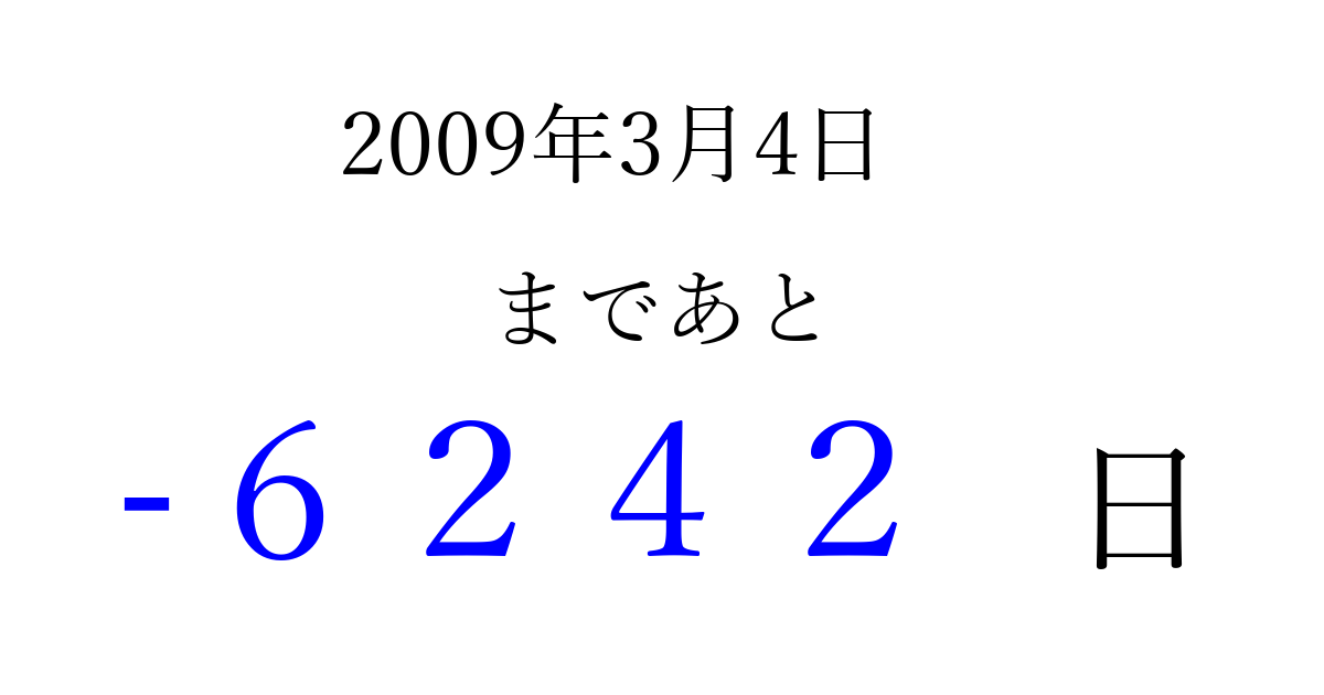 2009年3月4日(水)は もう 0000 日過ぎました 追加すると、トップページからすぐ選べるようになります ※2026/04/06現在の結果です。 最新の状態に更新する ↓シェアして、タイムライン上にカウントダウンを表示しよう!↓ 📤 この結果を共有する Tweet シェア Threads Bluesky 別の日付でカウントダウン 2009年3月のカレンダー このページをブックマークに追加すると、いつでもカウントダウンを確認できます。 (PC: Ctrl+D / Mac: ⌘+D) hitome-notes.comでは以下のページも運営しています。 指定日と期間から日付を計算 | ガチャ確率計算・シミュレーション | プライバシー・ポリシー 運営者:Avocado