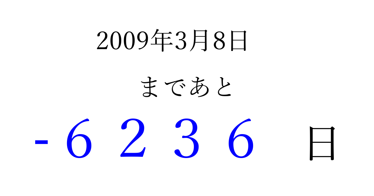 2009年3月8日(日)は もう 0000 日過ぎました 追加すると、トップページからすぐ選べるようになります ※2026/04/04現在の結果です。 最新の状態に更新する ↓シェアして、タイムライン上にカウントダウンを表示しよう!↓ 📤 この結果を共有する Tweet シェア Threads Bluesky 別の日付でカウントダウン 2009年3月のカレンダー このページをブックマークに追加すると、いつでもカウントダウンを確認できます。 (PC: Ctrl+D / Mac: ⌘+D) hitome-notes.comでは以下のページも運営しています。 指定日と期間から日付を計算 | ガチャ確率計算・シミュレーション | プライバシー・ポリシー 運営者:Avocado