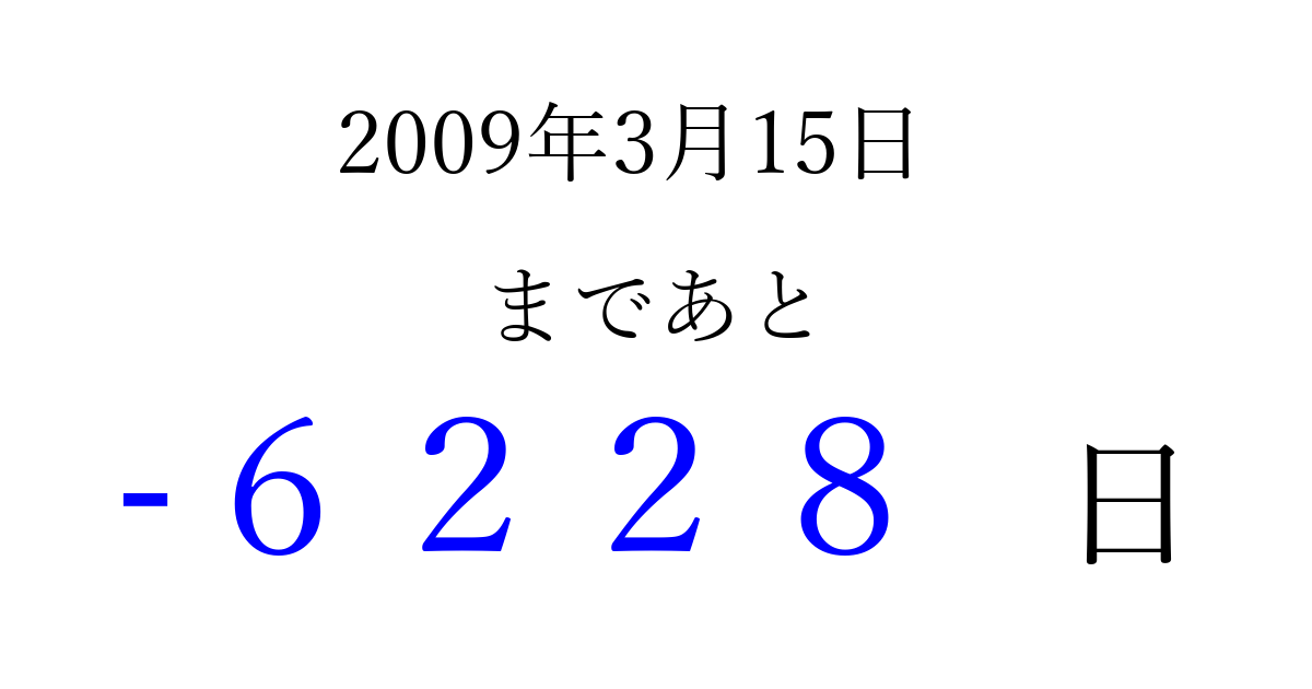 2009年3月15日(日)は もう 0000 日過ぎました 追加すると、トップページからすぐ選べるようになります ※2026/04/03現在の結果です。 最新の状態に更新する ↓シェアして、タイムライン上にカウントダウンを表示しよう!↓ 📤 この結果を共有する Tweet シェア Threads Bluesky 別の日付でカウントダウン 2009年3月のカレンダー このページをブックマークに追加すると、いつでもカウントダウンを確認できます。 (PC: Ctrl+D / Mac: ⌘+D) hitome-notes.comでは以下のページも運営しています。 指定日と期間から日付を計算 | ガチャ確率計算・シミュレーション | プライバシー・ポリシー 運営者:Avocado