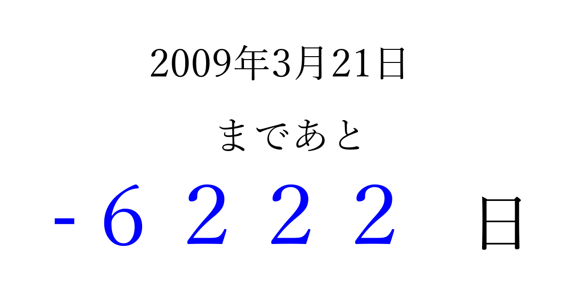 2009年3月21日(土)は もう 0000 日過ぎました 追加すると、トップページからすぐ選べるようになります ※2026/04/03現在の結果です。 最新の状態に更新する ↓シェアして、タイムライン上にカウントダウンを表示しよう!↓ 📤 この結果を共有する Tweet シェア Threads Bluesky 別の日付でカウントダウン 2009年3月のカレンダー このページをブックマークに追加すると、いつでもカウントダウンを確認できます。 (PC: Ctrl+D / Mac: ⌘+D) hitome-notes.comでは以下のページも運営しています。 指定日と期間から日付を計算 | ガチャ確率計算・シミュレーション | プライバシー・ポリシー 運営者:Avocado