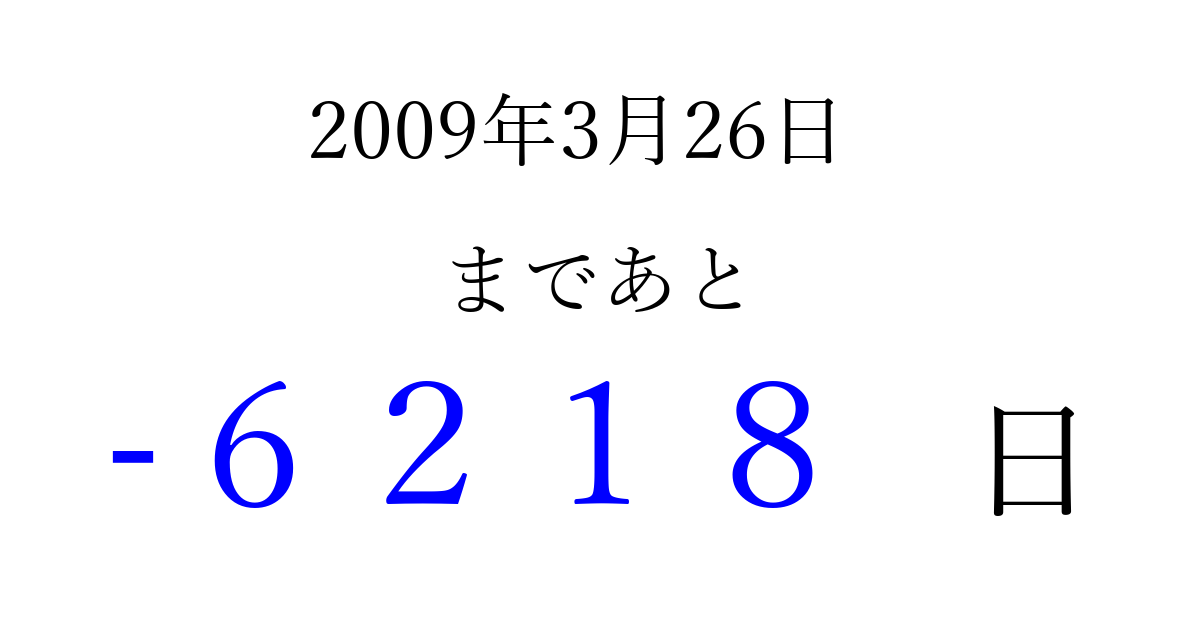 2009年3月26日(木)は もう 0000 日過ぎました 追加すると、トップページからすぐ選べるようになります ※2026/04/04現在の結果です。 最新の状態に更新する ↓シェアして、タイムライン上にカウントダウンを表示しよう!↓ 📤 この結果を共有する Tweet シェア Threads Bluesky 別の日付でカウントダウン 2009年3月のカレンダー このページをブックマークに追加すると、いつでもカウントダウンを確認できます。 (PC: Ctrl+D / Mac: ⌘+D) hitome-notes.comでは以下のページも運営しています。 指定日と期間から日付を計算 | ガチャ確率計算・シミュレーション | プライバシー・ポリシー 運営者:Avocado