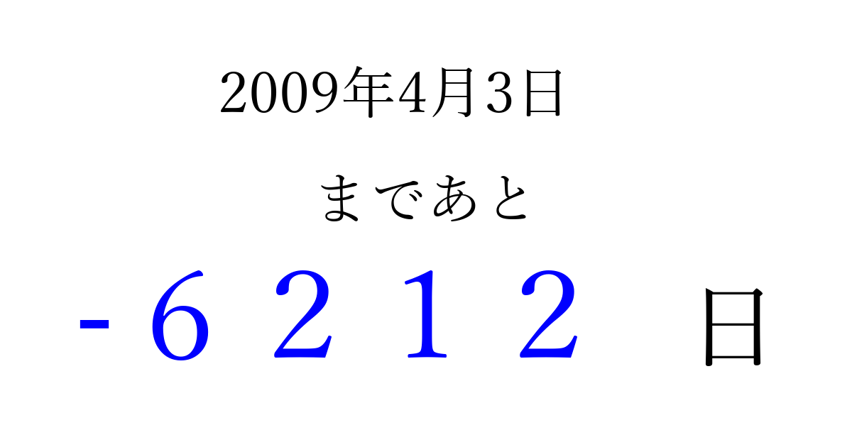 2009年4月3日(金)は もう 0000 日過ぎました 追加すると、トップページからすぐ選べるようになります ※2026/04/06現在の結果です。 最新の状態に更新する ↓シェアして、タイムライン上にカウントダウンを表示しよう!↓ 📤 この結果を共有する Tweet シェア Threads Bluesky 別の日付でカウントダウン 2009年4月のカレンダー このページをブックマークに追加すると、いつでもカウントダウンを確認できます。 (PC: Ctrl+D / Mac: ⌘+D) hitome-notes.comでは以下のページも運営しています。 指定日と期間から日付を計算 | ガチャ確率計算・シミュレーション | プライバシー・ポリシー 運営者:Avocado
