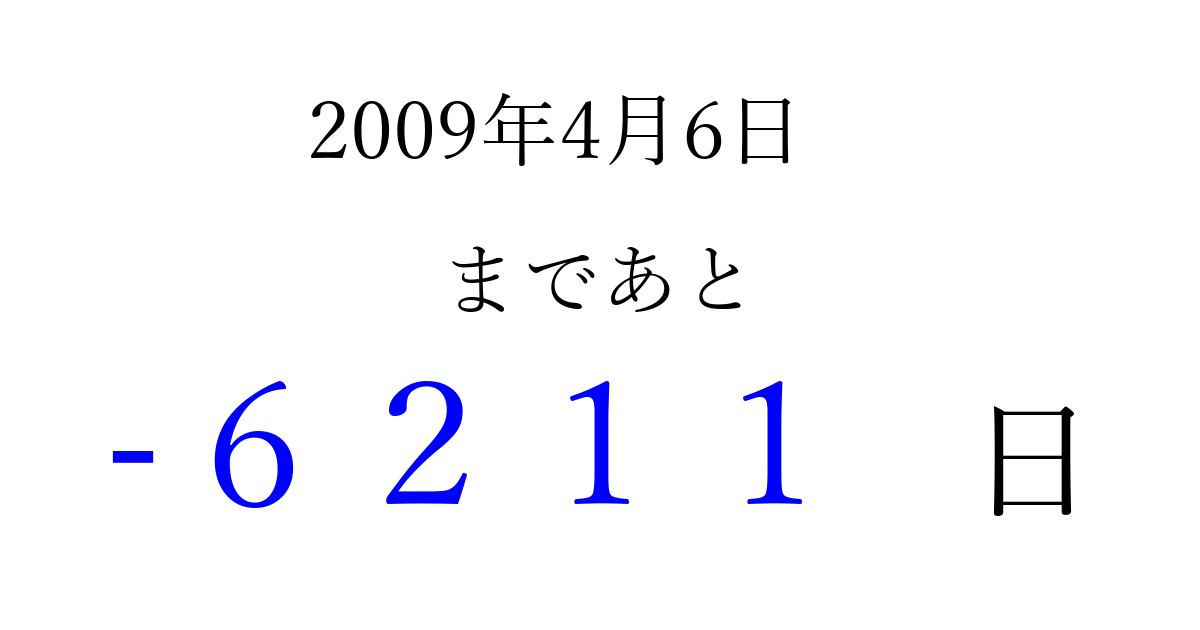 2009年4月6日(月)は もう 0000 日過ぎました 追加すると、トップページからすぐ選べるようになります ※2026/04/08現在の結果です。 最新の状態に更新する ↓シェアして、タイムライン上にカウントダウンを表示しよう!↓ 📤 この結果を共有する Tweet シェア Threads Bluesky 別の日付でカウントダウン 2009年4月のカレンダー このページをブックマークに追加すると、いつでもカウントダウンを確認できます。 (PC: Ctrl+D / Mac: ⌘+D) hitome-notes.comでは以下のページも運営しています。 指定日と期間から日付を計算 | ガチャ確率計算・シミュレーション | プライバシー・ポリシー 運営者:Avocado