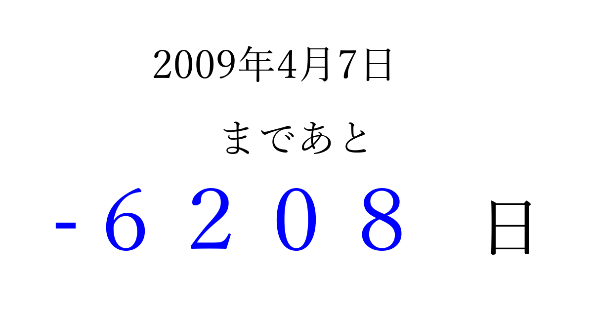 2009年4月7日(火)は もう 0000 日過ぎました 追加すると、トップページからすぐ選べるようになります ※2026/04/06現在の結果です。 最新の状態に更新する ↓シェアして、タイムライン上にカウントダウンを表示しよう!↓ 📤 この結果を共有する Tweet シェア Threads Bluesky 別の日付でカウントダウン 2009年4月のカレンダー このページをブックマークに追加すると、いつでもカウントダウンを確認できます。 (PC: Ctrl+D / Mac: ⌘+D) hitome-notes.comでは以下のページも運営しています。 指定日と期間から日付を計算 | ガチャ確率計算・シミュレーション | プライバシー・ポリシー 運営者:Avocado