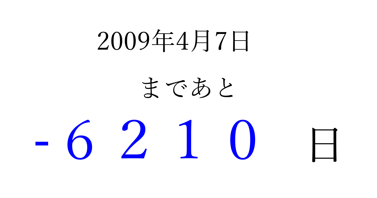 2009年4月7日(火)は もう 0000 日過ぎました 追加すると、トップページからすぐ選べるようになります ※2026/04/08現在の結果です。 最新の状態に更新する ↓シェアして、タイムライン上にカウントダウンを表示しよう!↓ 📤 この結果を共有する Tweet シェア Threads Bluesky 別の日付でカウントダウン 2009年4月のカレンダー このページをブックマークに追加すると、いつでもカウントダウンを確認できます。 (PC: Ctrl+D / Mac: ⌘+D) hitome-notes.comでは以下のページも運営しています。 指定日と期間から日付を計算 | ガチャ確率計算・シミュレーション | プライバシー・ポリシー 運営者:Avocado
