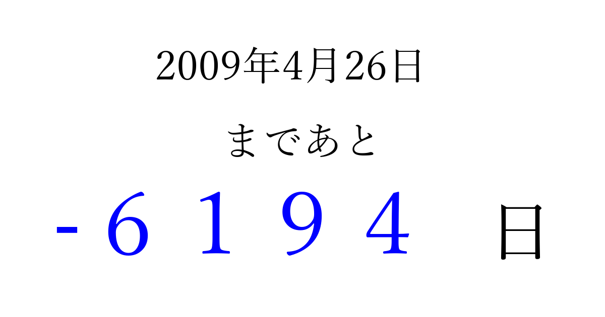 2009年4月26日(日)は もう 0000 日過ぎました 追加すると、トップページからすぐ選べるようになります ※2026/04/11現在の結果です。 最新の状態に更新する ↓シェアして、タイムライン上にカウントダウンを表示しよう!↓ 📤 この結果を共有する Tweet シェア Threads Bluesky 別の日付でカウントダウン 2009年4月のカレンダー このページをブックマークに追加すると、いつでもカウントダウンを確認できます。 (PC: Ctrl+D / Mac: ⌘+D) hitome-notes.comでは以下のページも運営しています。 指定日と期間から日付を計算 | ガチャ確率計算・シミュレーション | プライバシー・ポリシー 運営者:Avocado