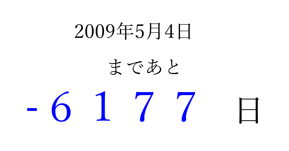2009年5月4日(月)は もう 0000 日過ぎました 追加すると、トップページからすぐ選べるようになります ※2026/04/02現在の結果です。 最新の状態に更新する ↓シェアして、タイムライン上にカウントダウンを表示しよう!↓ 📤 この結果を共有する Tweet シェア Threads Bluesky 別の日付でカウントダウン 2009年5月のカレンダー このページをブックマークに追加すると、いつでもカウントダウンを確認できます。 (PC: Ctrl+D / Mac: ⌘+D) hitome-notes.comでは以下のページも運営しています。 指定日と期間から日付を計算 | ガチャ確率計算・シミュレーション | プライバシー・ポリシー 運営者:Avocado