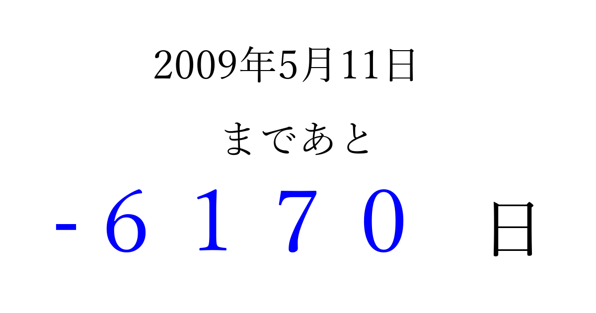 2009年5月11日(月)は もう 0000 日過ぎました 追加すると、トップページからすぐ選べるようになります ※2026/04/02現在の結果です。 最新の状態に更新する ↓シェアして、タイムライン上にカウントダウンを表示しよう!↓ 📤 この結果を共有する Tweet シェア Threads Bluesky 別の日付でカウントダウン 2009年5月のカレンダー このページをブックマークに追加すると、いつでもカウントダウンを確認できます。 (PC: Ctrl+D / Mac: ⌘+D) hitome-notes.comでは以下のページも運営しています。 指定日と期間から日付を計算 | ガチャ確率計算・シミュレーション | プライバシー・ポリシー 運営者:Avocado