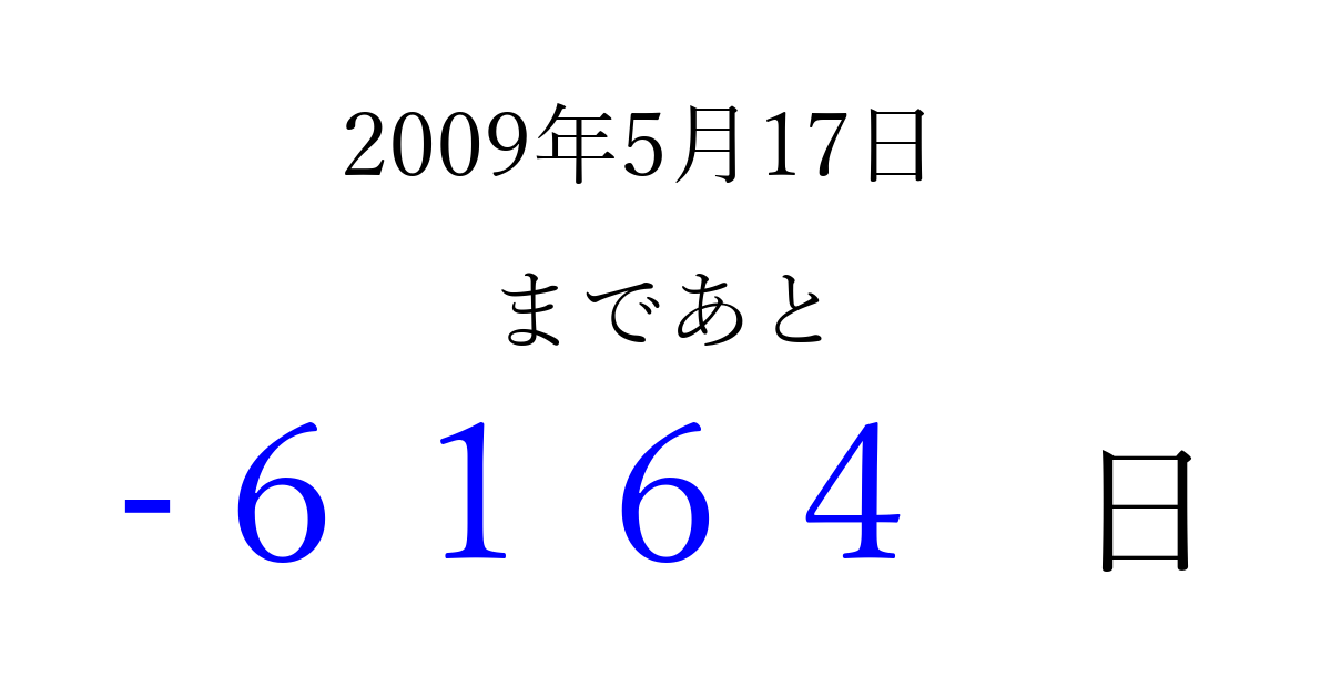 2009年5月17日(日)は もう 0000 日過ぎました 追加すると、トップページからすぐ選べるようになります ※2026/04/02現在の結果です。 最新の状態に更新する ↓シェアして、タイムライン上にカウントダウンを表示しよう!↓ 📤 この結果を共有する Tweet シェア Threads Bluesky 別の日付でカウントダウン 2009年5月のカレンダー このページをブックマークに追加すると、いつでもカウントダウンを確認できます。 (PC: Ctrl+D / Mac: ⌘+D) hitome-notes.comでは以下のページも運営しています。 指定日と期間から日付を計算 | ガチャ確率計算・シミュレーション | プライバシー・ポリシー 運営者:Avocado