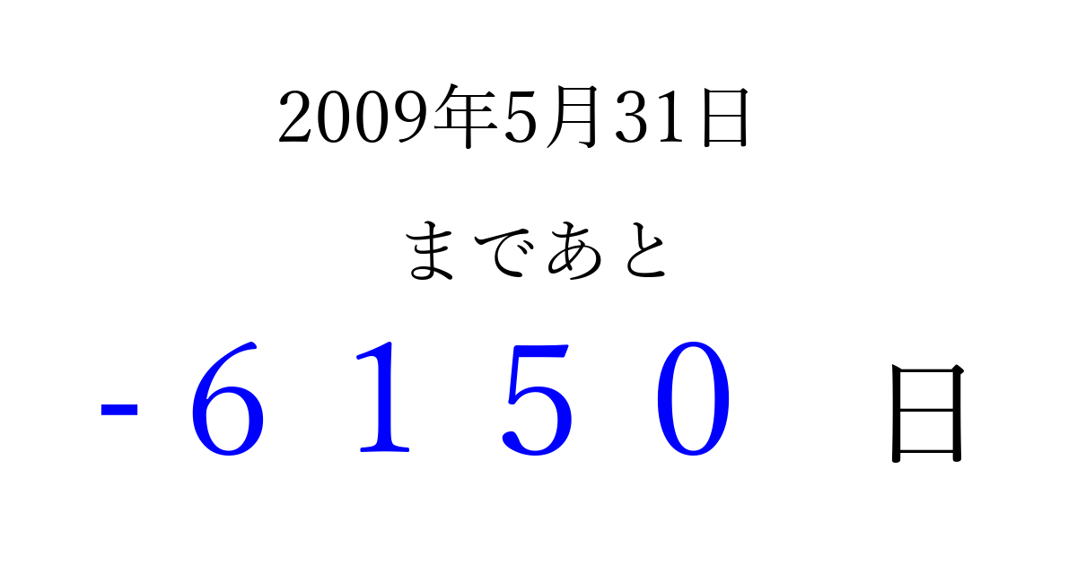 2009年5月31日(日)は もう 0000 日過ぎました 追加すると、トップページからすぐ選べるようになります ※2026/04/02現在の結果です。 最新の状態に更新する ↓シェアして、タイムライン上にカウントダウンを表示しよう!↓ 📤 この結果を共有する Tweet シェア Threads Bluesky 別の日付でカウントダウン 2009年5月のカレンダー このページをブックマークに追加すると、いつでもカウントダウンを確認できます。 (PC: Ctrl+D / Mac: ⌘+D) hitome-notes.comでは以下のページも運営しています。 指定日と期間から日付を計算 | ガチャ確率計算・シミュレーション | プライバシー・ポリシー 運営者:Avocado