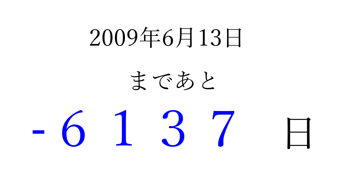 2009年6月13日(土)は もう 0000 日過ぎました 追加すると、トップページからすぐ選べるようになります ※2026/04/02現在の結果です。 最新の状態に更新する ↓シェアして、タイムライン上にカウントダウンを表示しよう!↓ 📤 この結果を共有する Tweet シェア Threads Bluesky 別の日付でカウントダウン 2009年6月のカレンダー このページをブックマークに追加すると、いつでもカウントダウンを確認できます。 (PC: Ctrl+D / Mac: ⌘+D) hitome-notes.comでは以下のページも運営しています。 指定日と期間から日付を計算 | ガチャ確率計算・シミュレーション | プライバシー・ポリシー 運営者:Avocado