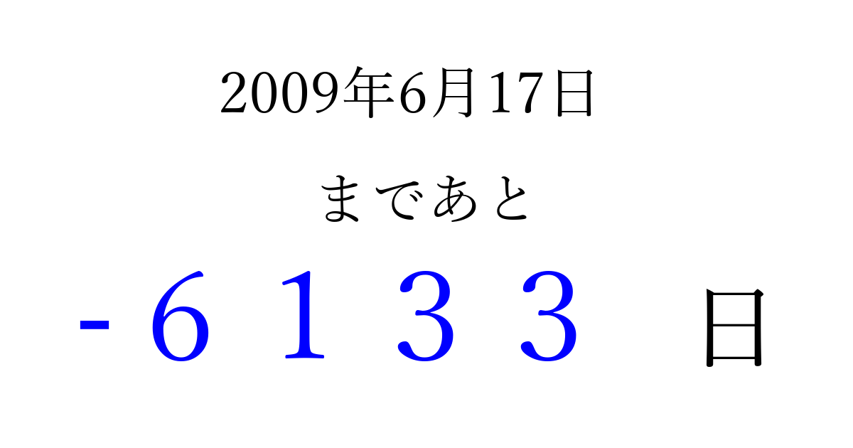 2009年6月17日(水)は もう 0000 日過ぎました 追加すると、トップページからすぐ選べるようになります ※2026/04/02現在の結果です。 最新の状態に更新する ↓シェアして、タイムライン上にカウントダウンを表示しよう!↓ 📤 この結果を共有する Tweet シェア Threads Bluesky 別の日付でカウントダウン 2009年6月のカレンダー このページをブックマークに追加すると、いつでもカウントダウンを確認できます。 (PC: Ctrl+D / Mac: ⌘+D) hitome-notes.comでは以下のページも運営しています。 指定日と期間から日付を計算 | ガチャ確率計算・シミュレーション | プライバシー・ポリシー 運営者:Avocado