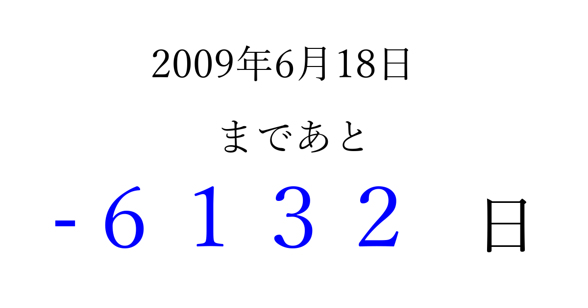 2009年6月18日(木)は もう 0000 日過ぎました 追加すると、トップページからすぐ選べるようになります ※2026/04/02現在の結果です。 最新の状態に更新する ↓シェアして、タイムライン上にカウントダウンを表示しよう!↓ 📤 この結果を共有する Tweet シェア Threads Bluesky 別の日付でカウントダウン 2009年6月のカレンダー このページをブックマークに追加すると、いつでもカウントダウンを確認できます。 (PC: Ctrl+D / Mac: ⌘+D) hitome-notes.comでは以下のページも運営しています。 指定日と期間から日付を計算 | ガチャ確率計算・シミュレーション | プライバシー・ポリシー 運営者:Avocado
