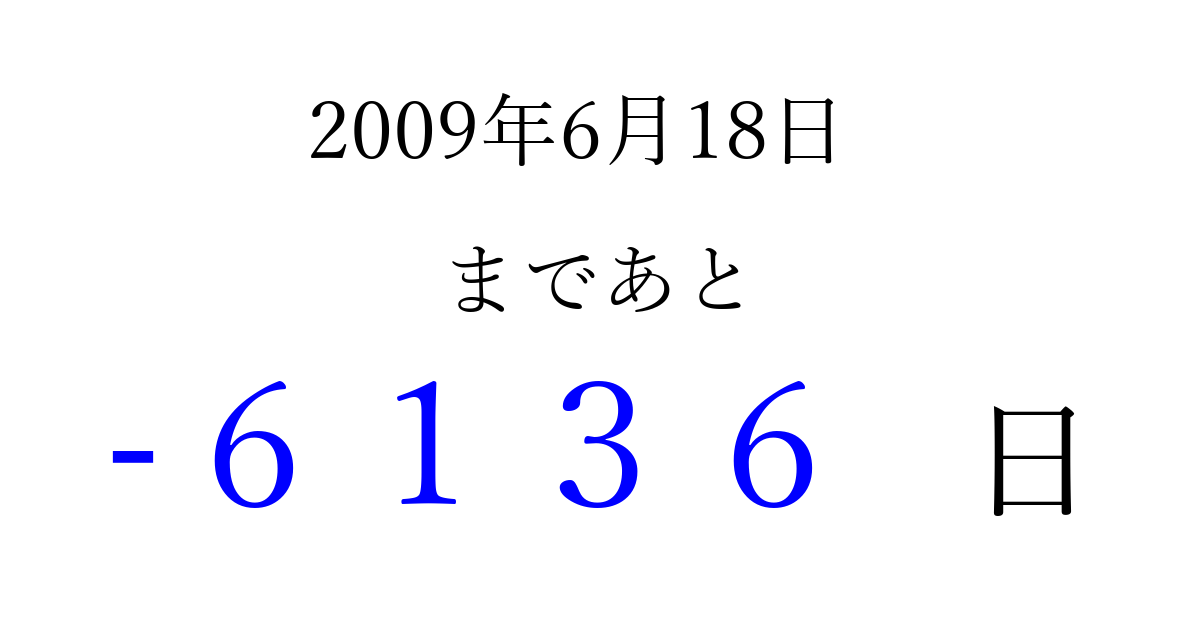 2009年6月18日(木)は もう 0000 日過ぎました 追加すると、トップページからすぐ選べるようになります ※2026/04/06現在の結果です。 最新の状態に更新する ↓シェアして、タイムライン上にカウントダウンを表示しよう!↓ 📤 この結果を共有する Tweet シェア Threads Bluesky 別の日付でカウントダウン 2009年6月のカレンダー このページをブックマークに追加すると、いつでもカウントダウンを確認できます。 (PC: Ctrl+D / Mac: ⌘+D) hitome-notes.comでは以下のページも運営しています。 指定日と期間から日付を計算 | ガチャ確率計算・シミュレーション | プライバシー・ポリシー 運営者:Avocado
