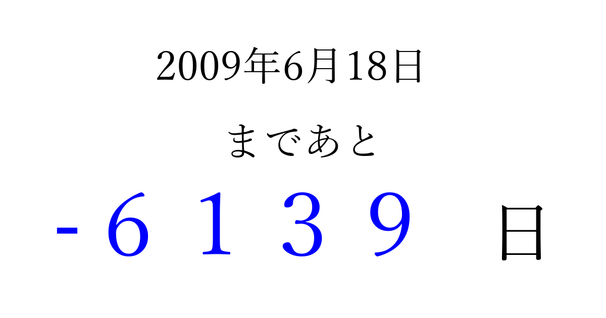 2009年6月18日(木)は もう 0000 日過ぎました 追加すると、トップページからすぐ選べるようになります ※2026/04/09現在の結果です。 最新の状態に更新する ↓シェアして、タイムライン上にカウントダウンを表示しよう!↓ 📤 この結果を共有する Tweet シェア Threads Bluesky 別の日付でカウントダウン 2009年6月のカレンダー このページをブックマークに追加すると、いつでもカウントダウンを確認できます。 (PC: Ctrl+D / Mac: ⌘+D) hitome-notes.comでは以下のページも運営しています。 指定日と期間から日付を計算 | ガチャ確率計算・シミュレーション | プライバシー・ポリシー 運営者:Avocado