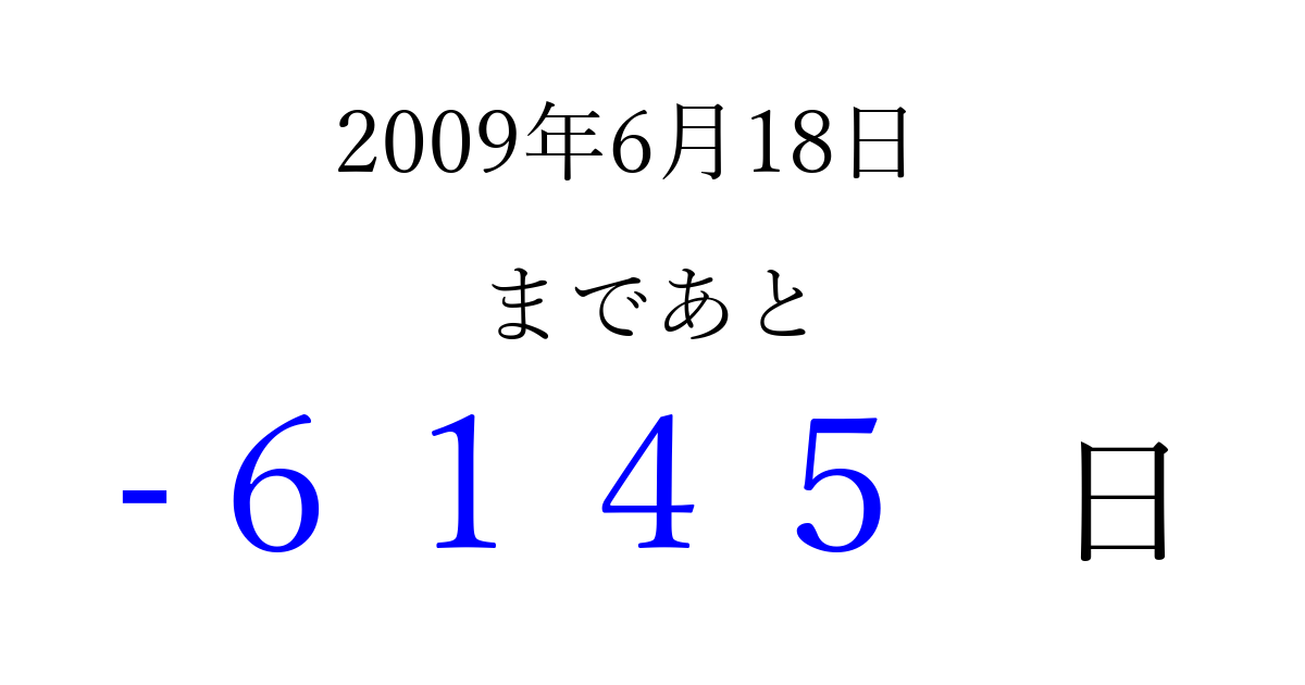 2009年6月18日(木)は もう 0000 日過ぎました 追加すると、トップページからすぐ選べるようになります ※2026/04/15現在の結果です。 最新の状態に更新する ↓シェアして、タイムライン上にカウントダウンを表示しよう!↓ 📤 この結果を共有する Tweet シェア Threads Bluesky 別の日付でカウントダウン 2009年6月のカレンダー このページをブックマークに追加すると、いつでもカウントダウンを確認できます。 (PC: Ctrl+D / Mac: ⌘+D) hitome-notes.comでは以下のページも運営しています。 指定日と期間から日付を計算 | ガチャ確率計算・シミュレーション | プライバシー・ポリシー 運営者:Avocado