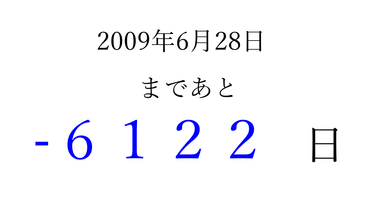 2009年6月28日(日)は もう 0000 日過ぎました 追加すると、トップページからすぐ選べるようになります ※2026/04/02現在の結果です。 最新の状態に更新する ↓シェアして、タイムライン上にカウントダウンを表示しよう!↓ 📤 この結果を共有する Tweet シェア Threads Bluesky 別の日付でカウントダウン 2009年6月のカレンダー このページをブックマークに追加すると、いつでもカウントダウンを確認できます。 (PC: Ctrl+D / Mac: ⌘+D) hitome-notes.comでは以下のページも運営しています。 指定日と期間から日付を計算 | ガチャ確率計算・シミュレーション | プライバシー・ポリシー 運営者:Avocado
