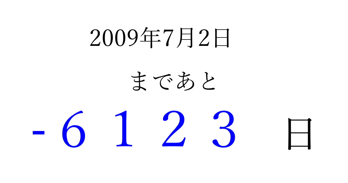 2009年7月2日(木)は もう 0000 日過ぎました 追加すると、トップページからすぐ選べるようになります ※2026/04/07現在の結果です。 最新の状態に更新する ↓シェアして、タイムライン上にカウントダウンを表示しよう!↓ 📤 この結果を共有する Tweet シェア Threads Bluesky 別の日付でカウントダウン 2009年7月のカレンダー このページをブックマークに追加すると、いつでもカウントダウンを確認できます。 (PC: Ctrl+D / Mac: ⌘+D) hitome-notes.comでは以下のページも運営しています。 指定日と期間から日付を計算 | ガチャ確率計算・シミュレーション | プライバシー・ポリシー 運営者:Avocado