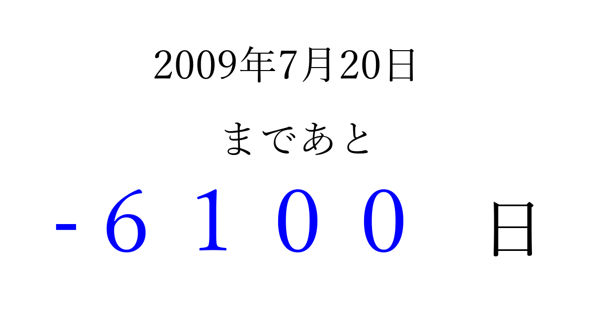 2009年7月20日(月)は もう 0000 日過ぎました 追加すると、トップページからすぐ選べるようになります ※2026/04/02現在の結果です。 最新の状態に更新する ↓シェアして、タイムライン上にカウントダウンを表示しよう!↓ 📤 この結果を共有する Tweet シェア Threads Bluesky 別の日付でカウントダウン 2009年7月のカレンダー このページをブックマークに追加すると、いつでもカウントダウンを確認できます。 (PC: Ctrl+D / Mac: ⌘+D) hitome-notes.comでは以下のページも運営しています。 指定日と期間から日付を計算 | ガチャ確率計算・シミュレーション | プライバシー・ポリシー 運営者:Avocado