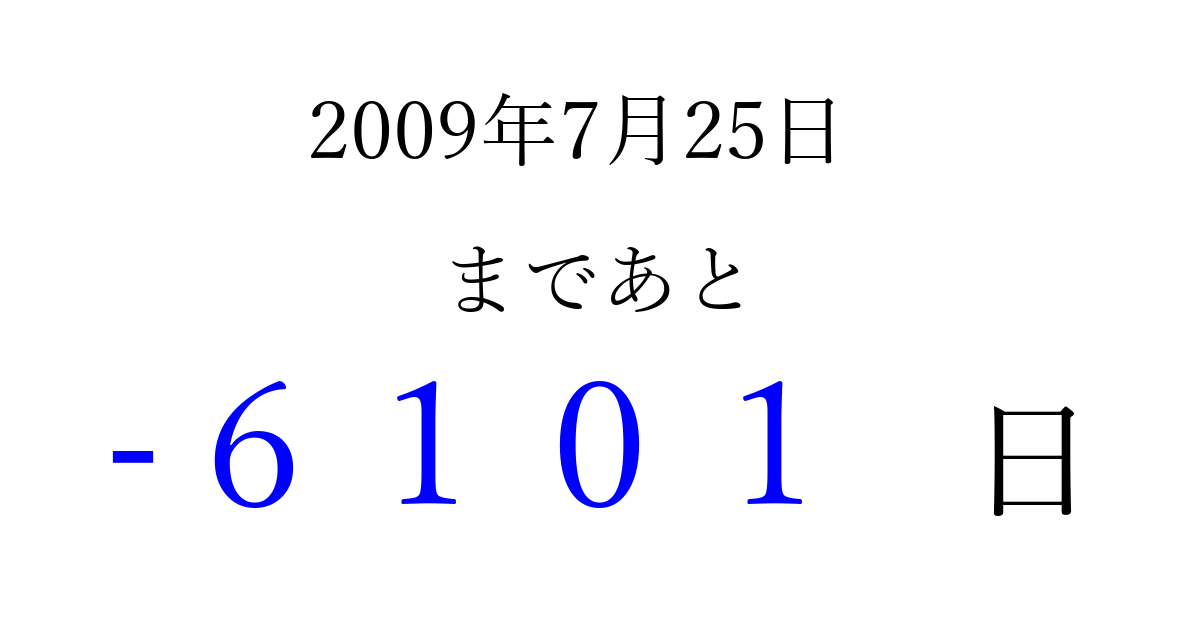 2009年7月25日(土)は もう 0000 日過ぎました 追加すると、トップページからすぐ選べるようになります ※2026/04/08現在の結果です。 最新の状態に更新する ↓シェアして、タイムライン上にカウントダウンを表示しよう!↓ 📤 この結果を共有する Tweet シェア Threads Bluesky 別の日付でカウントダウン 2009年7月のカレンダー このページをブックマークに追加すると、いつでもカウントダウンを確認できます。 (PC: Ctrl+D / Mac: ⌘+D) hitome-notes.comでは以下のページも運営しています。 指定日と期間から日付を計算 | ガチャ確率計算・シミュレーション | プライバシー・ポリシー 運営者:Avocado