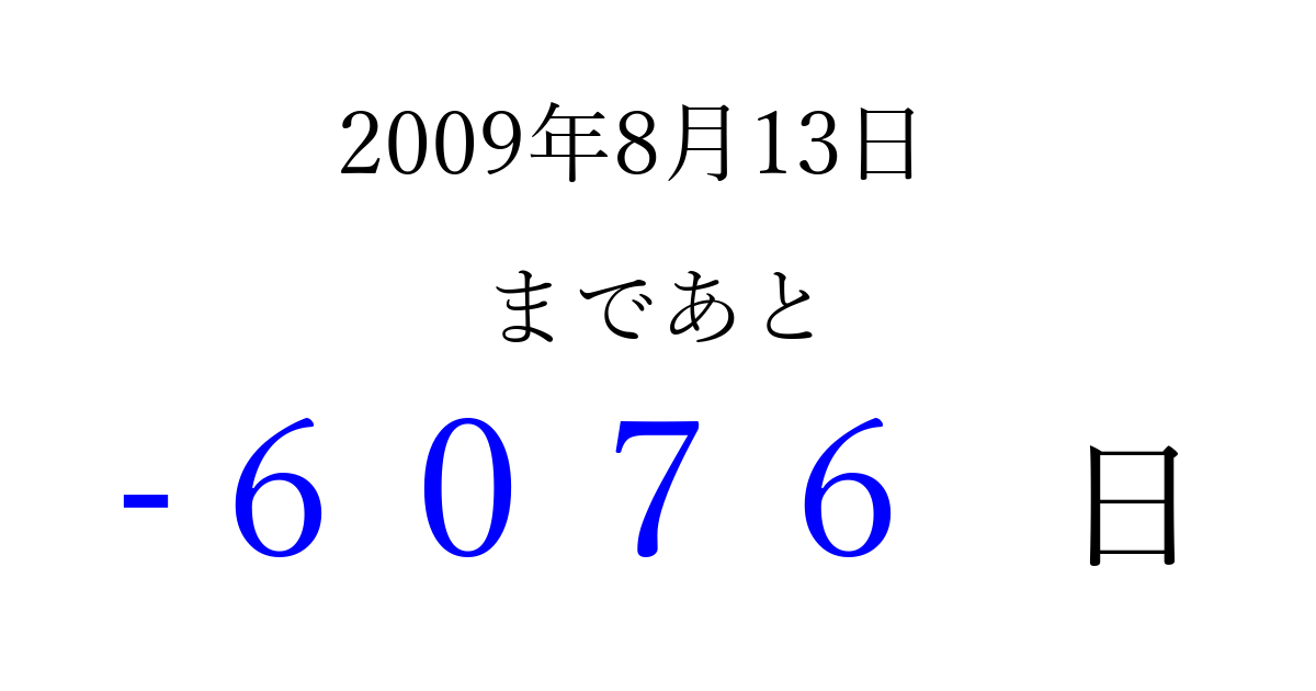 2009年8月13日(木)は もう 0000 日過ぎました 追加すると、トップページからすぐ選べるようになります ※2026/04/02現在の結果です。 最新の状態に更新する ↓シェアして、タイムライン上にカウントダウンを表示しよう!↓ 📤 この結果を共有する Tweet シェア Threads Bluesky 別の日付でカウントダウン 2009年8月のカレンダー このページをブックマークに追加すると、いつでもカウントダウンを確認できます。 (PC: Ctrl+D / Mac: ⌘+D) hitome-notes.comでは以下のページも運営しています。 指定日と期間から日付を計算 | ガチャ確率計算・シミュレーション | プライバシー・ポリシー 運営者:Avocado