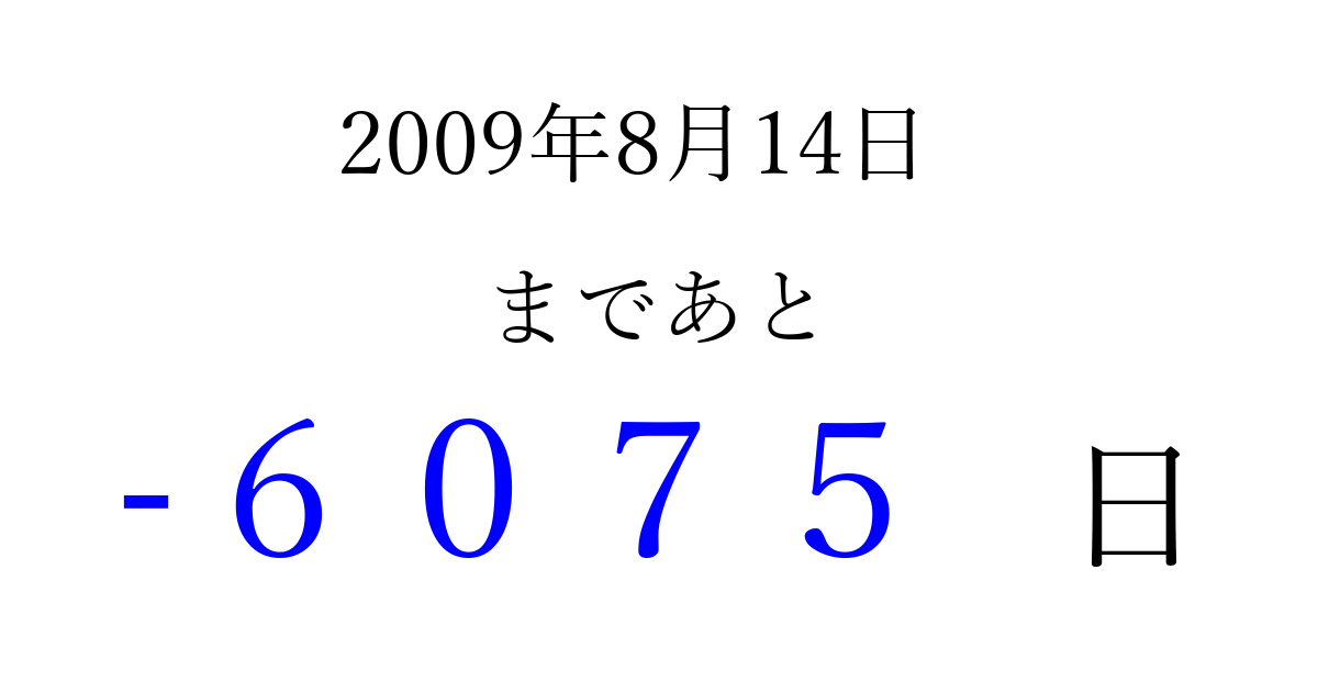 2009年8月14日(金)は もう 0000 日過ぎました 追加すると、トップページからすぐ選べるようになります ※2026/04/02現在の結果です。 最新の状態に更新する ↓シェアして、タイムライン上にカウントダウンを表示しよう!↓ 📤 この結果を共有する Tweet シェア Threads Bluesky 別の日付でカウントダウン 2009年8月のカレンダー このページをブックマークに追加すると、いつでもカウントダウンを確認できます。 (PC: Ctrl+D / Mac: ⌘+D) hitome-notes.comでは以下のページも運営しています。 指定日と期間から日付を計算 | ガチャ確率計算・シミュレーション | プライバシー・ポリシー 運営者:Avocado