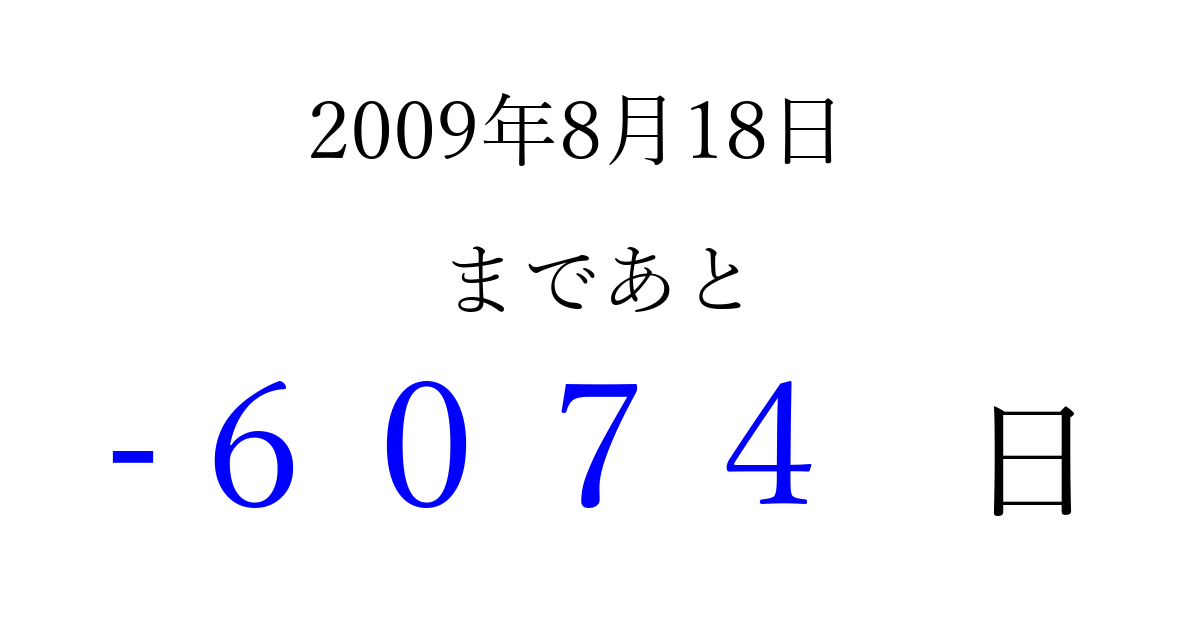 2009年8月18日(火)は もう 0000 日過ぎました 追加すると、トップページからすぐ選べるようになります ※2026/04/05現在の結果です。 最新の状態に更新する ↓シェアして、タイムライン上にカウントダウンを表示しよう!↓ 📤 この結果を共有する Tweet シェア Threads Bluesky 別の日付でカウントダウン 2009年8月のカレンダー このページをブックマークに追加すると、いつでもカウントダウンを確認できます。 (PC: Ctrl+D / Mac: ⌘+D) hitome-notes.comでは以下のページも運営しています。 指定日と期間から日付を計算 | ガチャ確率計算・シミュレーション | プライバシー・ポリシー 運営者:Avocado