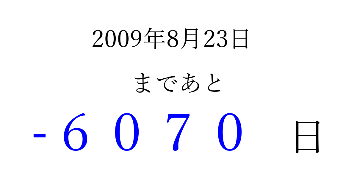 2009年8月23日(日)は もう 0000 日過ぎました 追加すると、トップページからすぐ選べるようになります ※2026/04/06現在の結果です。 最新の状態に更新する ↓シェアして、タイムライン上にカウントダウンを表示しよう!↓ 📤 この結果を共有する Tweet シェア Threads Bluesky 別の日付でカウントダウン 2009年8月のカレンダー このページをブックマークに追加すると、いつでもカウントダウンを確認できます。 (PC: Ctrl+D / Mac: ⌘+D) hitome-notes.comでは以下のページも運営しています。 指定日と期間から日付を計算 | ガチャ確率計算・シミュレーション | プライバシー・ポリシー 運営者:Avocado