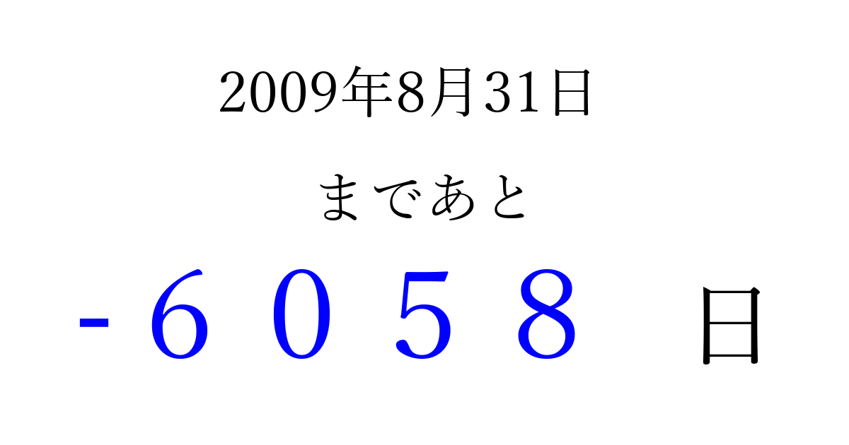 2009年8月31日(月)は もう 0000 日過ぎました 追加すると、トップページからすぐ選べるようになります ※2026/04/02現在の結果です。 最新の状態に更新する ↓シェアして、タイムライン上にカウントダウンを表示しよう!↓ 📤 この結果を共有する Tweet シェア Threads Bluesky 別の日付でカウントダウン 2009年8月のカレンダー このページをブックマークに追加すると、いつでもカウントダウンを確認できます。 (PC: Ctrl+D / Mac: ⌘+D) hitome-notes.comでは以下のページも運営しています。 指定日と期間から日付を計算 | ガチャ確率計算・シミュレーション | プライバシー・ポリシー 運営者:Avocado