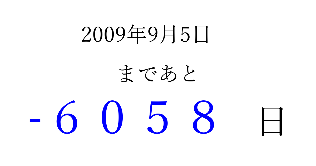 2009年9月5日(土)は もう 0000 日過ぎました 追加すると、トップページからすぐ選べるようになります ※2026/04/07現在の結果です。 最新の状態に更新する ↓シェアして、タイムライン上にカウントダウンを表示しよう!↓ 📤 この結果を共有する Tweet シェア Threads Bluesky 別の日付でカウントダウン 2009年9月のカレンダー このページをブックマークに追加すると、いつでもカウントダウンを確認できます。 (PC: Ctrl+D / Mac: ⌘+D) hitome-notes.comでは以下のページも運営しています。 指定日と期間から日付を計算 | ガチャ確率計算・シミュレーション | プライバシー・ポリシー 運営者:Avocado