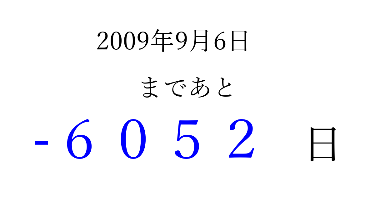2009年9月6日(日)は もう 0000 日過ぎました 追加すると、トップページからすぐ選べるようになります ※2026/04/02現在の結果です。 最新の状態に更新する ↓シェアして、タイムライン上にカウントダウンを表示しよう!↓ 📤 この結果を共有する Tweet シェア Threads Bluesky 別の日付でカウントダウン 2009年9月のカレンダー このページをブックマークに追加すると、いつでもカウントダウンを確認できます。 (PC: Ctrl+D / Mac: ⌘+D) hitome-notes.comでは以下のページも運営しています。 指定日と期間から日付を計算 | ガチャ確率計算・シミュレーション | プライバシー・ポリシー 運営者:Avocado