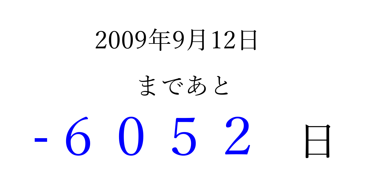 2009年9月12日(土)は もう 0000 日過ぎました 追加すると、トップページからすぐ選べるようになります ※2026/04/08現在の結果です。 最新の状態に更新する ↓シェアして、タイムライン上にカウントダウンを表示しよう!↓ 📤 この結果を共有する Tweet シェア Threads Bluesky 別の日付でカウントダウン 2009年9月のカレンダー このページをブックマークに追加すると、いつでもカウントダウンを確認できます。 (PC: Ctrl+D / Mac: ⌘+D) hitome-notes.comでは以下のページも運営しています。 指定日と期間から日付を計算 | ガチャ確率計算・シミュレーション | プライバシー・ポリシー 運営者:Avocado
