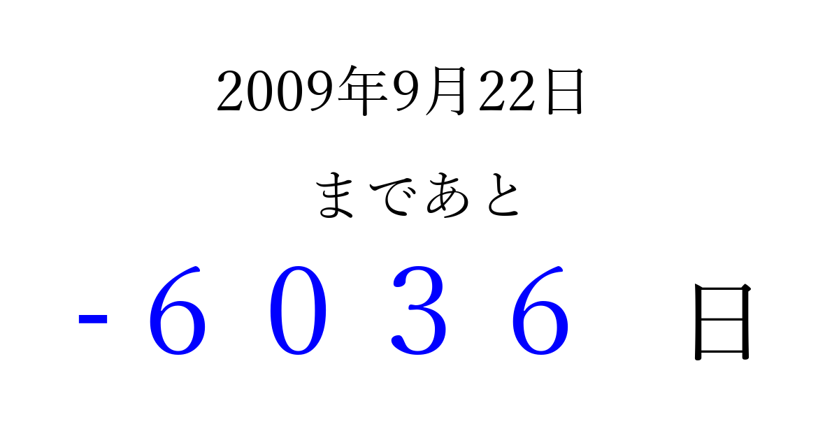 2009年9月22日(火)は もう 0000 日過ぎました 追加すると、トップページからすぐ選べるようになります ※2026/04/02現在の結果です。 最新の状態に更新する ↓シェアして、タイムライン上にカウントダウンを表示しよう!↓ 📤 この結果を共有する Tweet シェア Threads Bluesky 別の日付でカウントダウン 2009年9月のカレンダー このページをブックマークに追加すると、いつでもカウントダウンを確認できます。 (PC: Ctrl+D / Mac: ⌘+D) hitome-notes.comでは以下のページも運営しています。 指定日と期間から日付を計算 | ガチャ確率計算・シミュレーション | プライバシー・ポリシー 運営者:Avocado