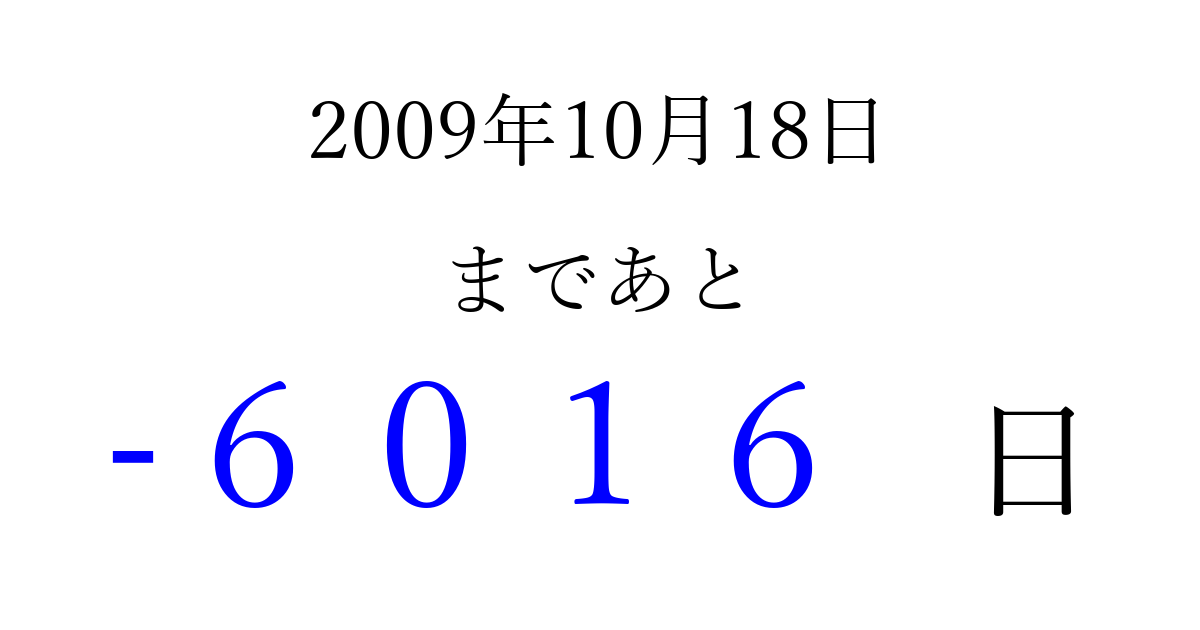 2009年10月18日(日)は もう 0000 日過ぎました 追加すると、トップページからすぐ選べるようになります ※2026/04/08現在の結果です。 最新の状態に更新する ↓シェアして、タイムライン上にカウントダウンを表示しよう!↓ 📤 この結果を共有する Tweet シェア Threads Bluesky 別の日付でカウントダウン 2009年10月のカレンダー このページをブックマークに追加すると、いつでもカウントダウンを確認できます。 (PC: Ctrl+D / Mac: ⌘+D) hitome-notes.comでは以下のページも運営しています。 指定日と期間から日付を計算 | ガチャ確率計算・シミュレーション | プライバシー・ポリシー 運営者:Avocado