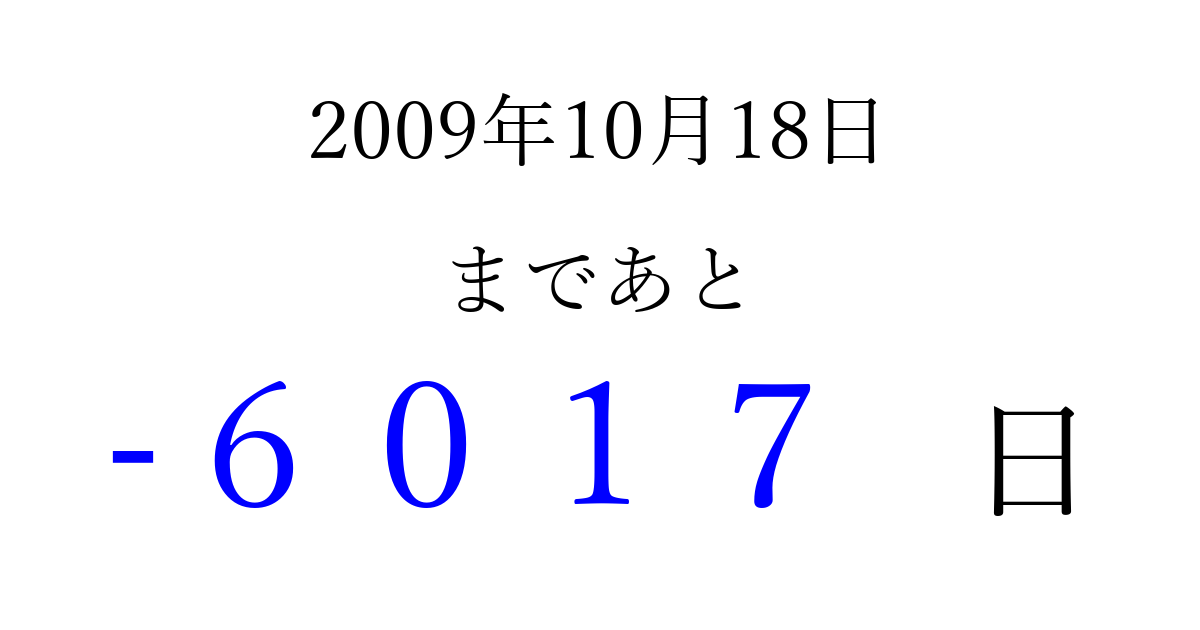 2009年10月18日(日)は もう 0000 日過ぎました 追加すると、トップページからすぐ選べるようになります ※2026/04/09現在の結果です。 最新の状態に更新する ↓シェアして、タイムライン上にカウントダウンを表示しよう!↓ 📤 この結果を共有する Tweet シェア Threads Bluesky 別の日付でカウントダウン 2009年10月のカレンダー このページをブックマークに追加すると、いつでもカウントダウンを確認できます。 (PC: Ctrl+D / Mac: ⌘+D) hitome-notes.comでは以下のページも運営しています。 指定日と期間から日付を計算 | ガチャ確率計算・シミュレーション | プライバシー・ポリシー 運営者:Avocado