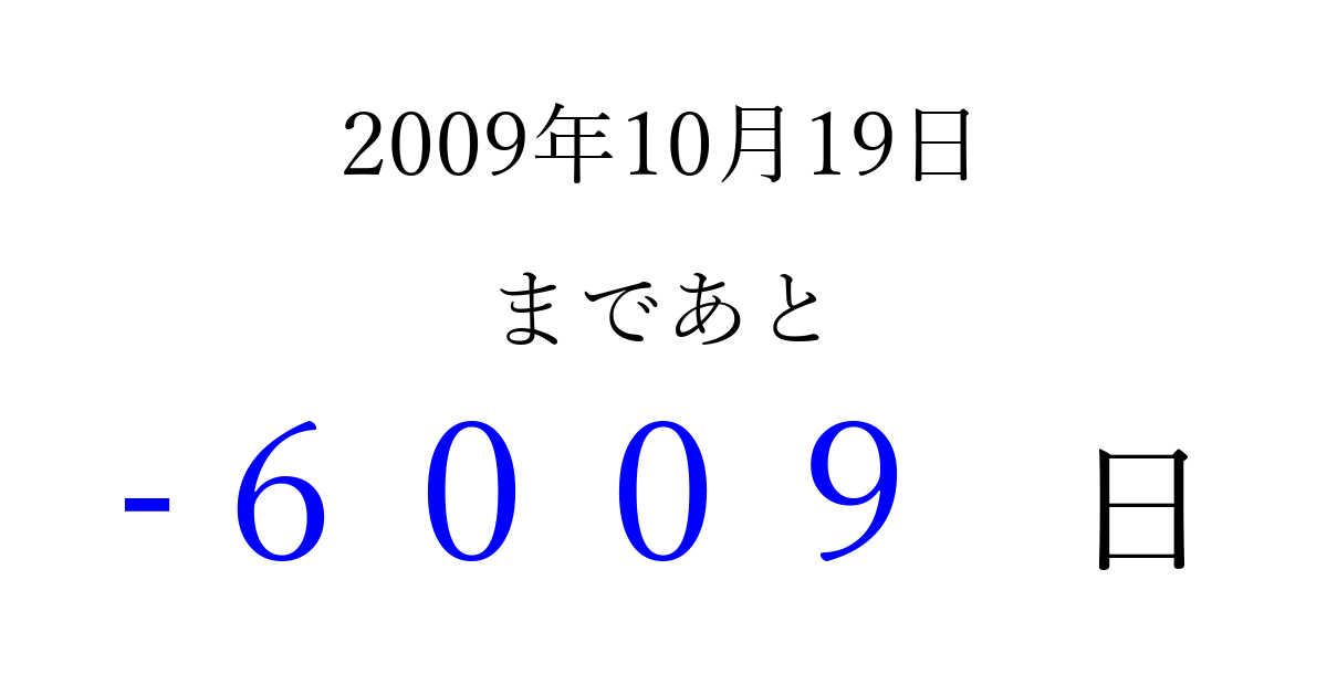 2009年10月19日(月)は もう 0000 日過ぎました 追加すると、トップページからすぐ選べるようになります ※2026/04/02現在の結果です。 最新の状態に更新する ↓シェアして、タイムライン上にカウントダウンを表示しよう!↓ 📤 この結果を共有する Tweet シェア Threads Bluesky 別の日付でカウントダウン 2009年10月のカレンダー このページをブックマークに追加すると、いつでもカウントダウンを確認できます。 (PC: Ctrl+D / Mac: ⌘+D) hitome-notes.comでは以下のページも運営しています。 指定日と期間から日付を計算 | ガチャ確率計算・シミュレーション | プライバシー・ポリシー 運営者:Avocado