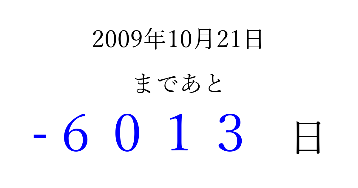 2009年10月21日(水)は もう 0000 日過ぎました 追加すると、トップページからすぐ選べるようになります ※2026/04/08現在の結果です。 最新の状態に更新する ↓シェアして、タイムライン上にカウントダウンを表示しよう!↓ 📤 この結果を共有する Tweet シェア Threads Bluesky 別の日付でカウントダウン 2009年10月のカレンダー このページをブックマークに追加すると、いつでもカウントダウンを確認できます。 (PC: Ctrl+D / Mac: ⌘+D) hitome-notes.comでは以下のページも運営しています。 指定日と期間から日付を計算 | ガチャ確率計算・シミュレーション | プライバシー・ポリシー 運営者:Avocado