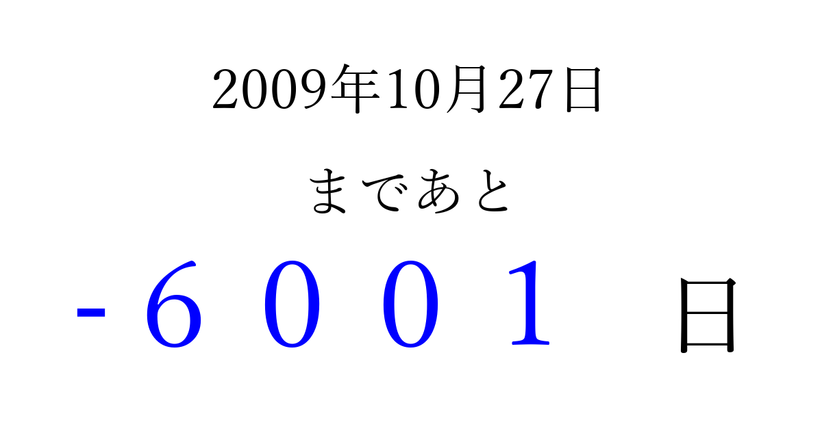 2009年10月27日(火)は もう 0000 日過ぎました 追加すると、トップページからすぐ選べるようになります ※2026/04/02現在の結果です。 最新の状態に更新する ↓シェアして、タイムライン上にカウントダウンを表示しよう!↓ 📤 この結果を共有する Tweet シェア Threads Bluesky 別の日付でカウントダウン 2009年10月のカレンダー このページをブックマークに追加すると、いつでもカウントダウンを確認できます。 (PC: Ctrl+D / Mac: ⌘+D) hitome-notes.comでは以下のページも運営しています。 指定日と期間から日付を計算 | ガチャ確率計算・シミュレーション | プライバシー・ポリシー 運営者:Avocado