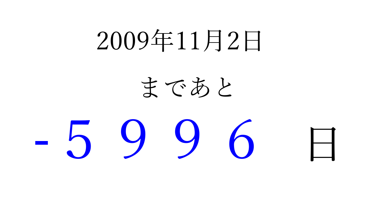 2009年11月2日(月)は もう 0000 日過ぎました 追加すると、トップページからすぐ選べるようになります ※2026/04/03現在の結果です。 最新の状態に更新する ↓シェアして、タイムライン上にカウントダウンを表示しよう!↓ 📤 この結果を共有する Tweet シェア Threads Bluesky 別の日付でカウントダウン 2009年11月のカレンダー このページをブックマークに追加すると、いつでもカウントダウンを確認できます。 (PC: Ctrl+D / Mac: ⌘+D) hitome-notes.comでは以下のページも運営しています。 指定日と期間から日付を計算 | ガチャ確率計算・シミュレーション | プライバシー・ポリシー 運営者:Avocado
