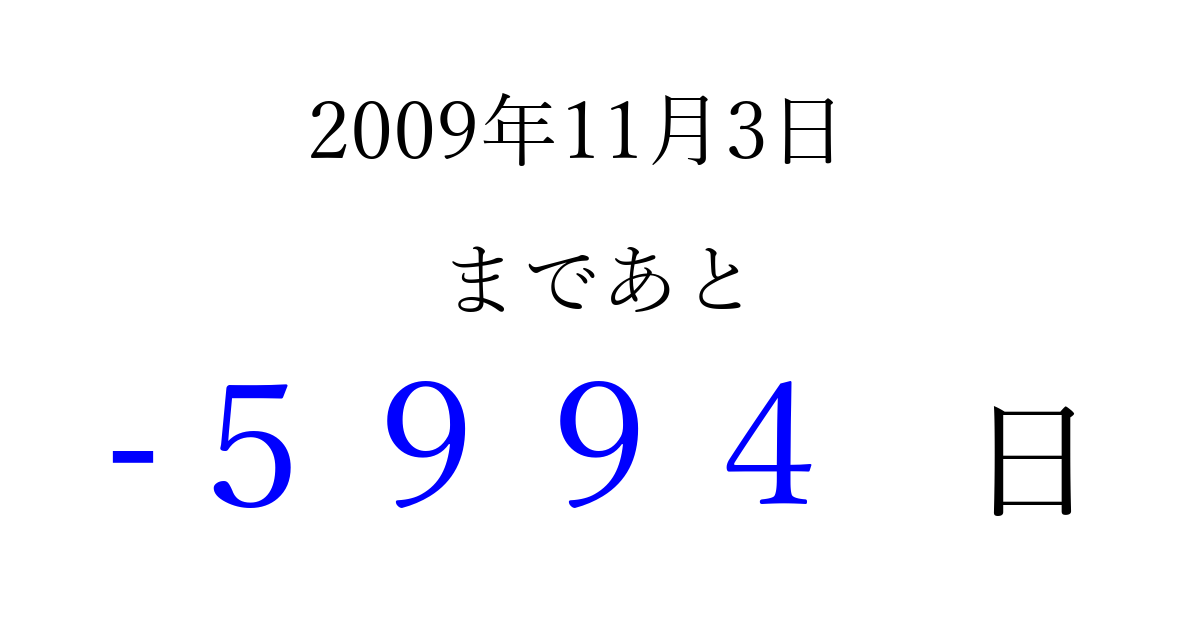 2009年11月3日(火)は もう 0000 日過ぎました 追加すると、トップページからすぐ選べるようになります ※2026/04/02現在の結果です。 最新の状態に更新する ↓シェアして、タイムライン上にカウントダウンを表示しよう!↓ 📤 この結果を共有する Tweet シェア Threads Bluesky 別の日付でカウントダウン 2009年11月のカレンダー このページをブックマークに追加すると、いつでもカウントダウンを確認できます。 (PC: Ctrl+D / Mac: ⌘+D) hitome-notes.comでは以下のページも運営しています。 指定日と期間から日付を計算 | ガチャ確率計算・シミュレーション | プライバシー・ポリシー 運営者:Avocado